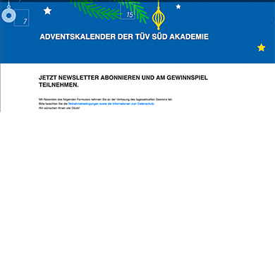 Der Adventskalender wurde sowohl visuell dem CI der TÜV SÜD Akademie angepasst, als auch technisch allen Sicherheits- und Datenschutzrichtlinien. ars navigandi fand eine schlanke Stand-Alone Lösung, die maximale Flexibilität bei der Gestaltung, Funktionsweise und Implementierung bietet.