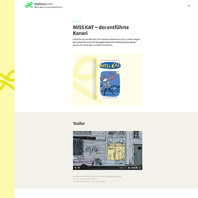 Um den das Key Visual des limbion Buchrückens auch in der Gestaltung der Webseite aufzugreifen, wurde die bestehende Gestaltung auf ein WordPress-Theme von Anders Norén umgestellt. Die Navigation befindet sich in einem farbig abgesetzten Streifen links auf dem Screen. Dies entspricht dem Aufbau der Buchserie von limbionbooks. Um die Vielfalt der unterschiedlichen Bücher zu betonen, wurden am Theme einige Funktionserweiterungen vorgenommen. Der limbion Buchrücken nimmt, je nach Gestaltung des Buchcover, eine eigene Schlüsselfarbe an. Beim Blättern durch das Buchsortiment passt sich die Farbe des Streifens, der Farbe des präsentierten Buchrückens an. Auch die Farbigkeit des Logos entspricht der Buchcover Gestaltung.