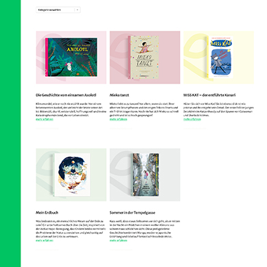 - Abbilden des Portfolios, welches Bilderbücher, Graphic Novels, Comics, Silent Books, Mangas, Romane und Genre-Mischungen für das Lesealter ab 3 Jahren umfasst.