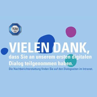 Unter dem Motto „Einer für alle“ informieren die Vorstände der TÜV SÜD AG über den aktuellen Stand des Unternehmens und beantworten die Fragen der Mitarbeiter. Da die Präsenz-Events „TÜV SÜD im Dialog” aufgrund der aktuellen Situation derzeit nicht möglich sind, finden diese im Jahr 2021 als rein digitale Veranstaltungen im Internet statt.